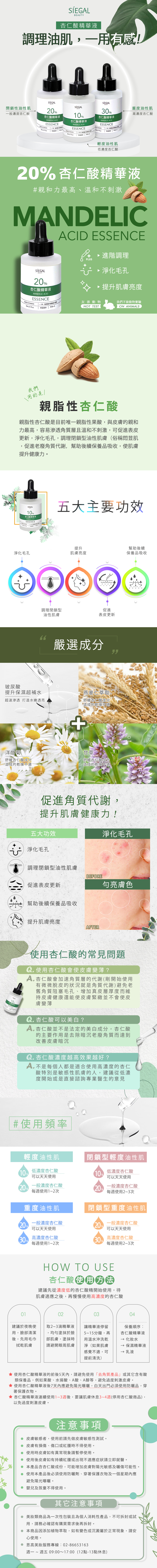 【注意事項】皮膚敏感者,使用前請先做皮膚敏感性測試。皮膚有損傷、傷口或紅腫時不得使用。使用時皮膚如有異常現象請暫停使用。使用後皮膚如有持續紅腫或出現不適應症狀請立即就醫。本產品含杏仁酸成份,可能增加皮膚對陽光敏感及曬傷可能性。使用本產品後必須使用防曬劑、穿著保護衣物及一個星期內應避免陽光曝曬。嬰兒及孩童不得使用。