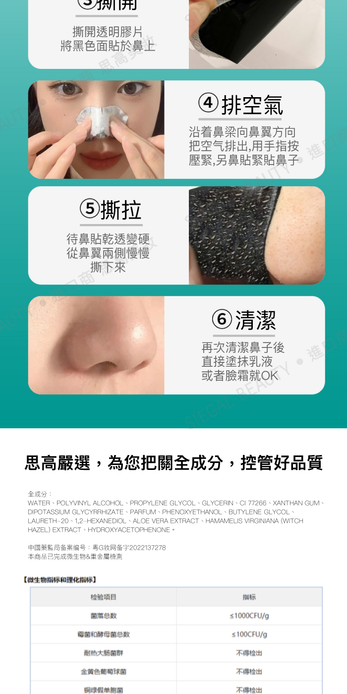 使用方法:鼻頭清潔去油後,先用清水沾濕鼻頭,然後撕開透明膠片貼上鼻貼,靜待20分鐘鼻貼完全乾透,從鼻翼兩側慢慢撕開鼻貼即可,建議每天只能使用1次。