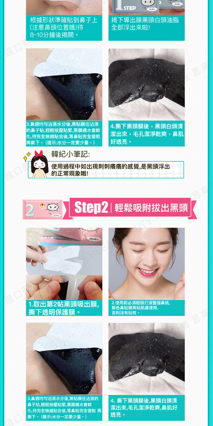 第二步:將鼻頭用清水沾濕後,取出第2片「去黑頭鼻膜貼」,撕去膠片將光滑面貼於鼻部,等待約