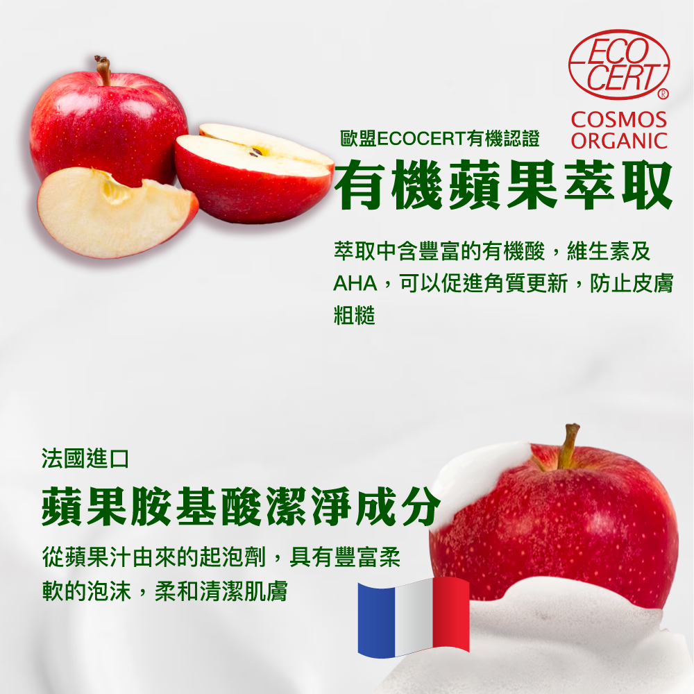 思高「胺基酸潔顏慕斯」採用法國蘋果胺基酸潔淨成分,搭配歐盟ECOCERT有機認證
