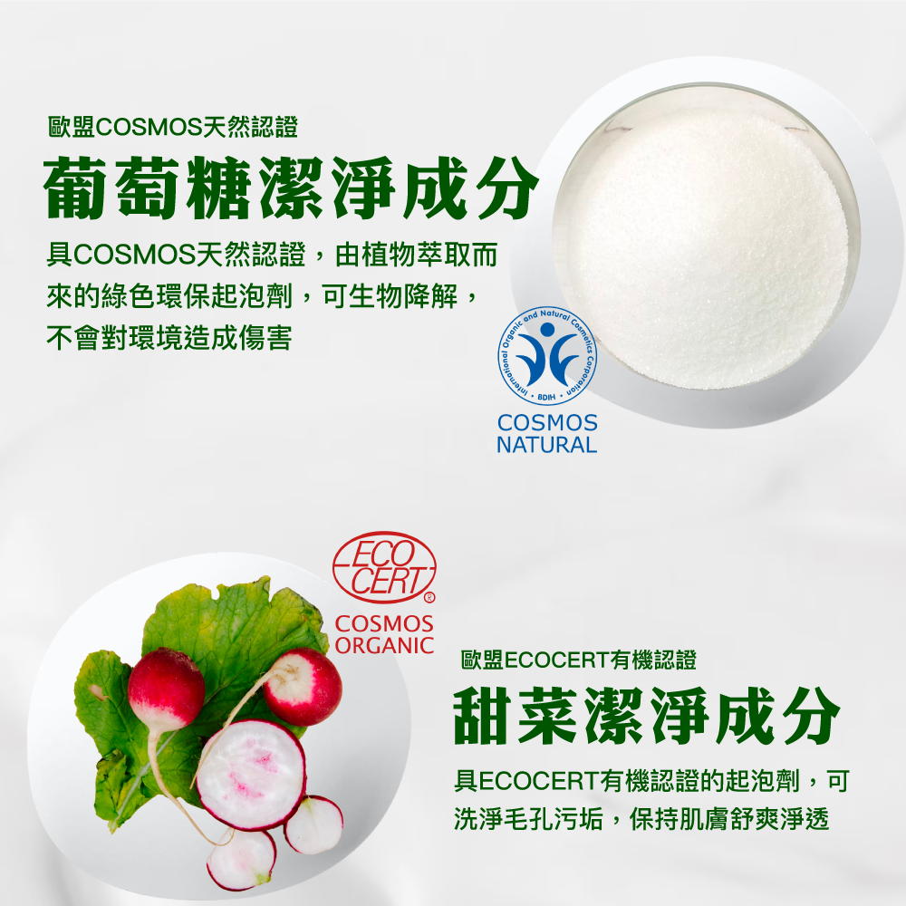 甜菜潔淨成分及德國COSMOS天然認證葡萄糖潔淨成分,pH5.5~6.5弱酸配方,能溫和潔淨肌膚,洗後不乾澀,