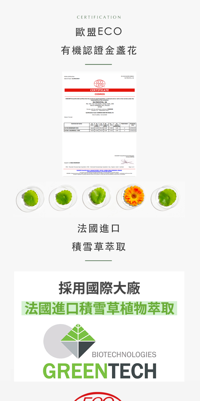 🔸 蘊含2種天然植萃,添加法國進口積雪草植萃及歐盟ECO有機認證金盞花植萃!