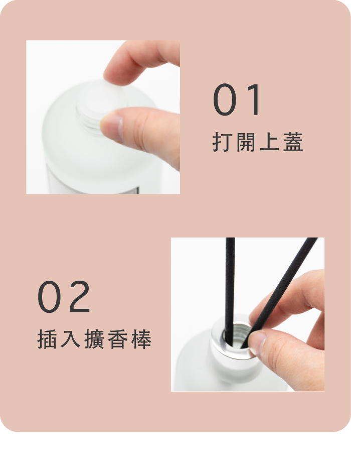 打開經典款擴香瓶的瓶蓋,放入擴香棒後即可擴香,可以依據個人喜好選擇放入的擴香棒數量,來控制香味濃淡度喔!