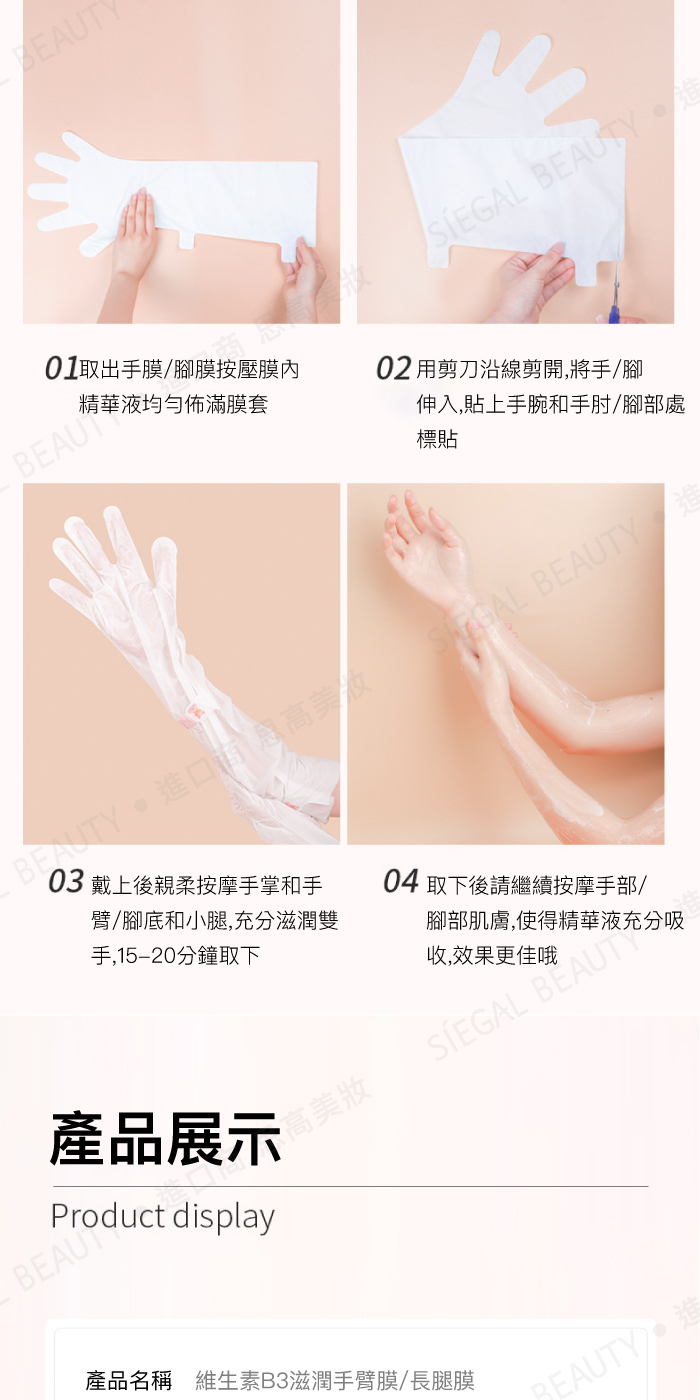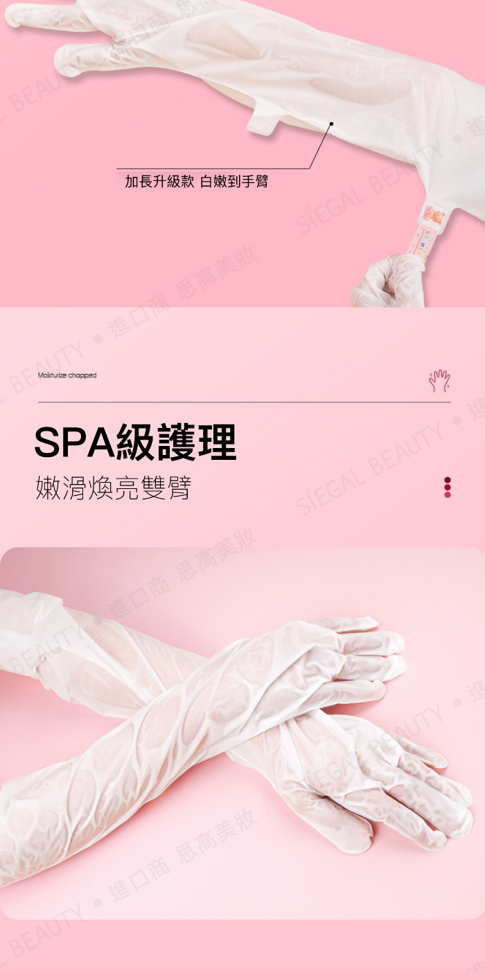 使用方法:清潔雙手後擦拭乾淨,打開手膜將手膜套上,敷約15分鐘後取下,再以清水清洗。