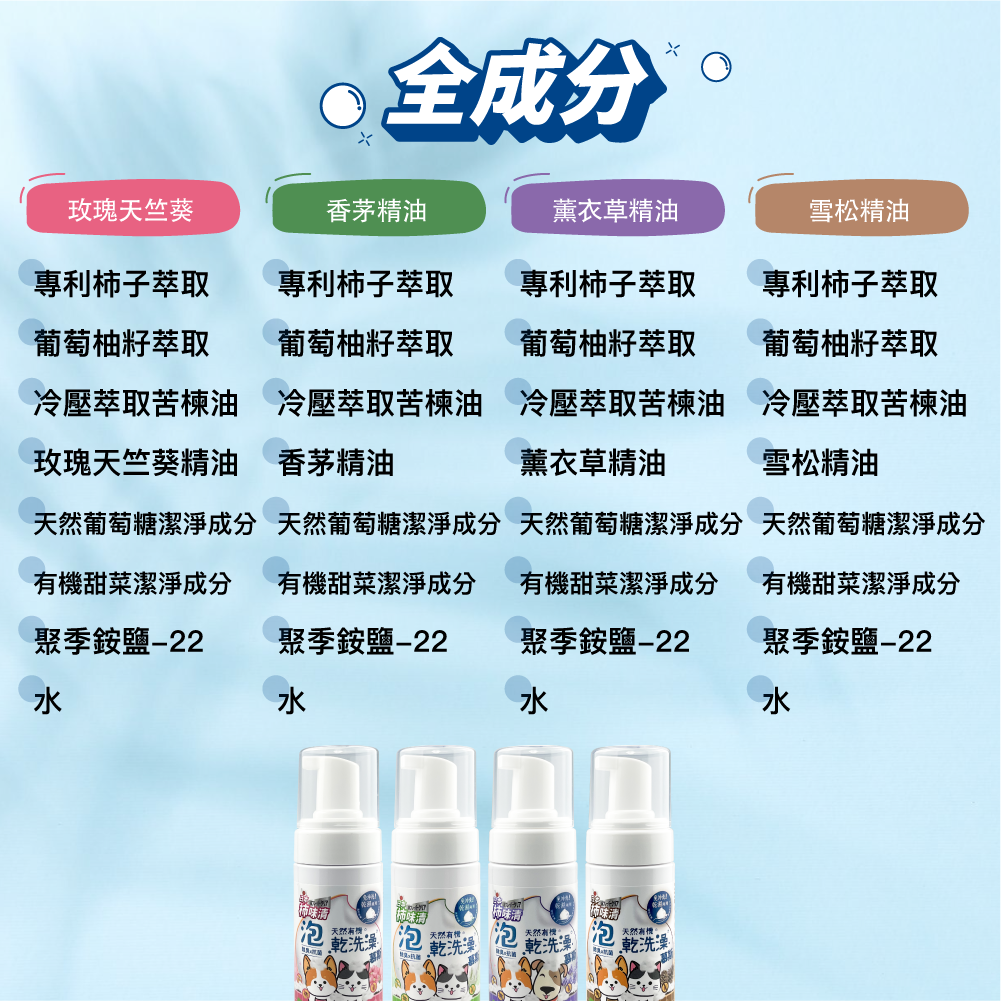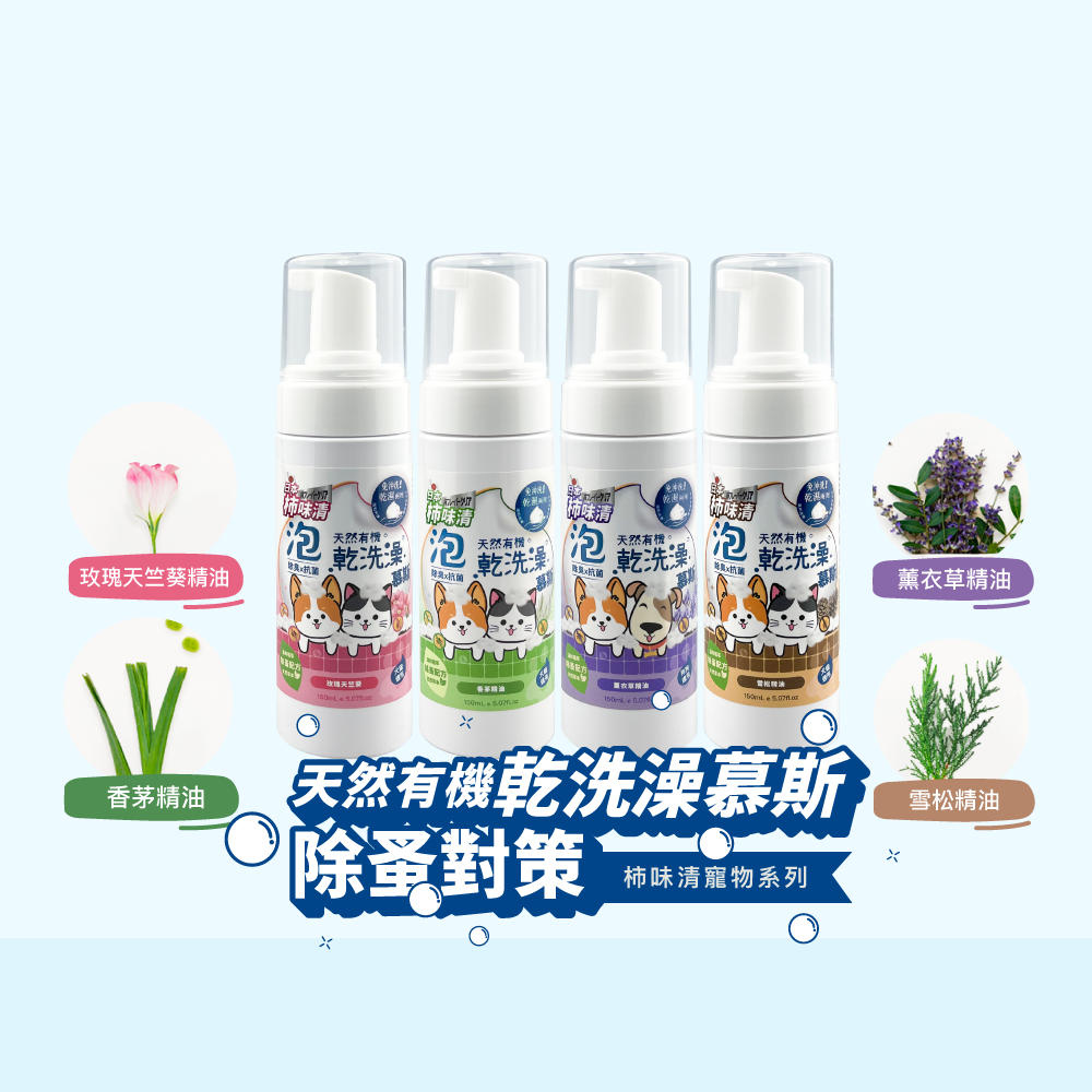 搭配4款寵物友善精油,玫瑰天竺葵、香茅、雪松及薰衣草,調製成4款不同香氛的寵物除蚤乾洗澡慕斯,