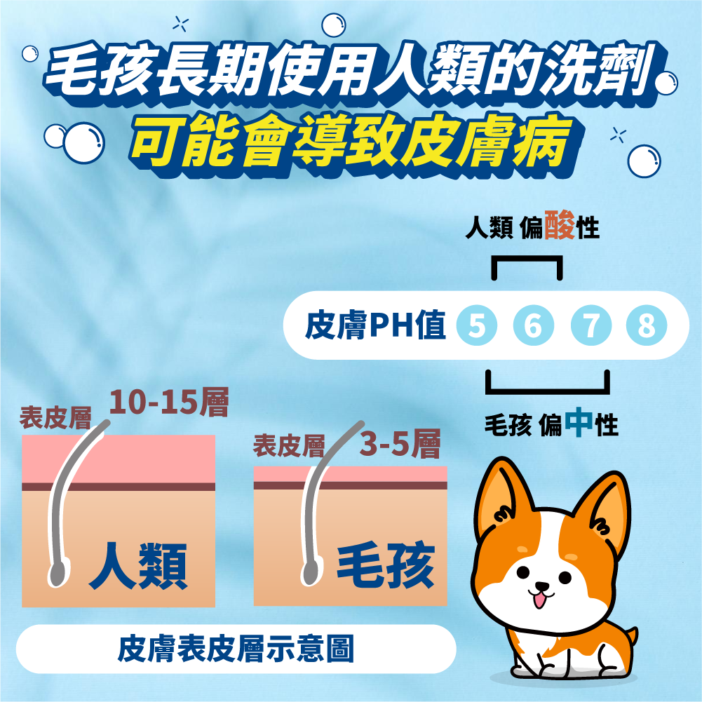 毛孩的肌膚與人類不同,如果讓毛孩使用人類用的洗髮精洗毛,是容易讓毛孩產生皮膚病喔,因為毛孩的皮膚pH值範圍約為5.5~7.5偏中性,而人類則是5.2~6.2,屬弱酸性,長期給毛孩使用人類的洗髮精洗澡,會讓毛孩的皮膚變成細菌易孳生的溫床;毛孩的表皮層厚度為3~5層,而人類則為10~15層,相差有約3倍之多,因此毛孩的皮膚較薄,比嬰兒還脆弱,由於人類的洗髮精清潔力較強,容易造成毛孩皮膚乾癢,讓毛孩不停地抓抓抓抓。