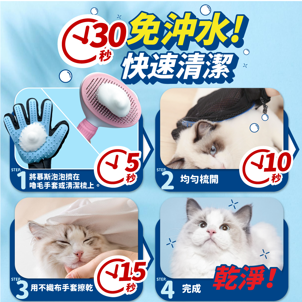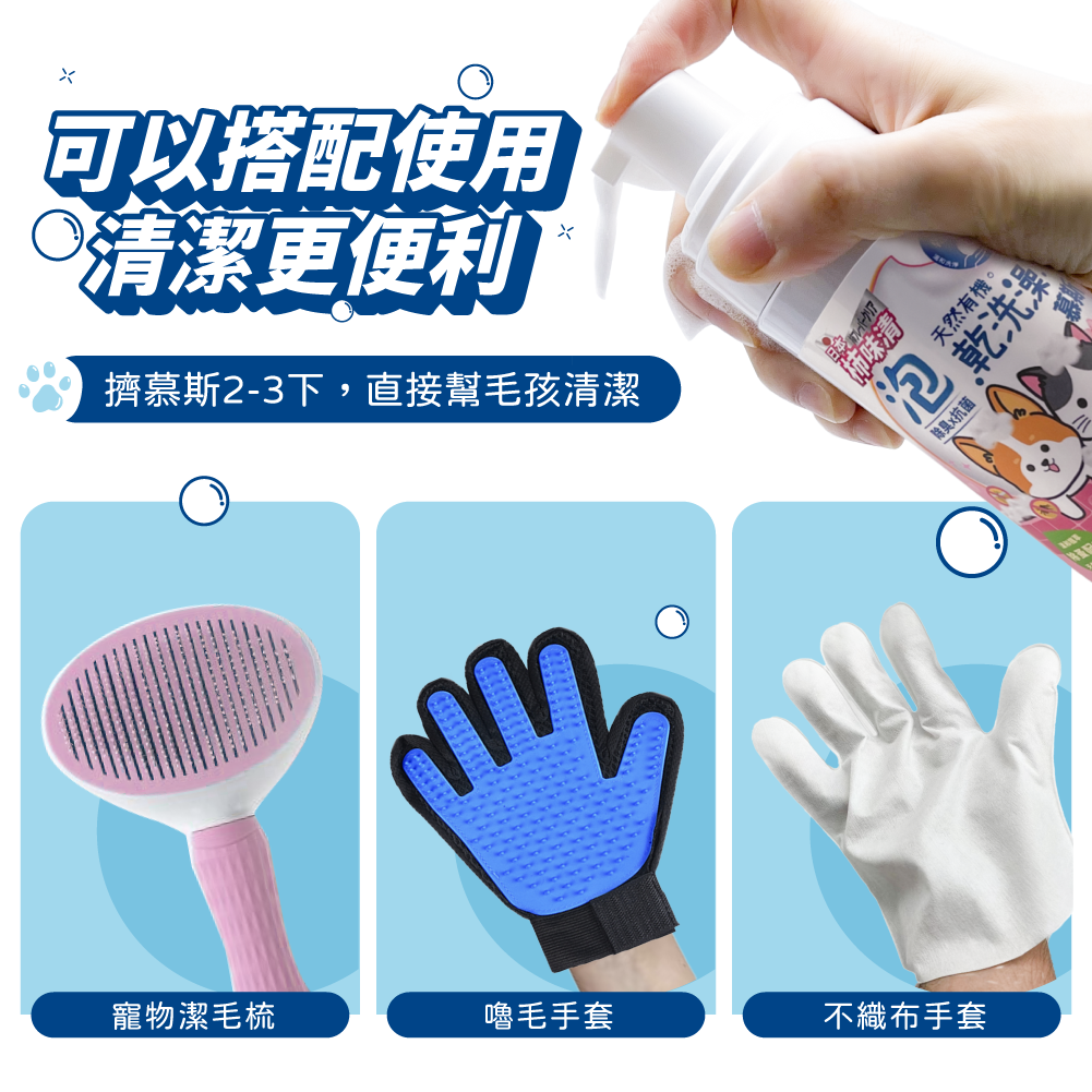 2潔毛手套:先將慕斯泡泡擠在潔毛手套或不織布手套上,然後輕輕按摩擦拭毛孩身上,免沖水。
