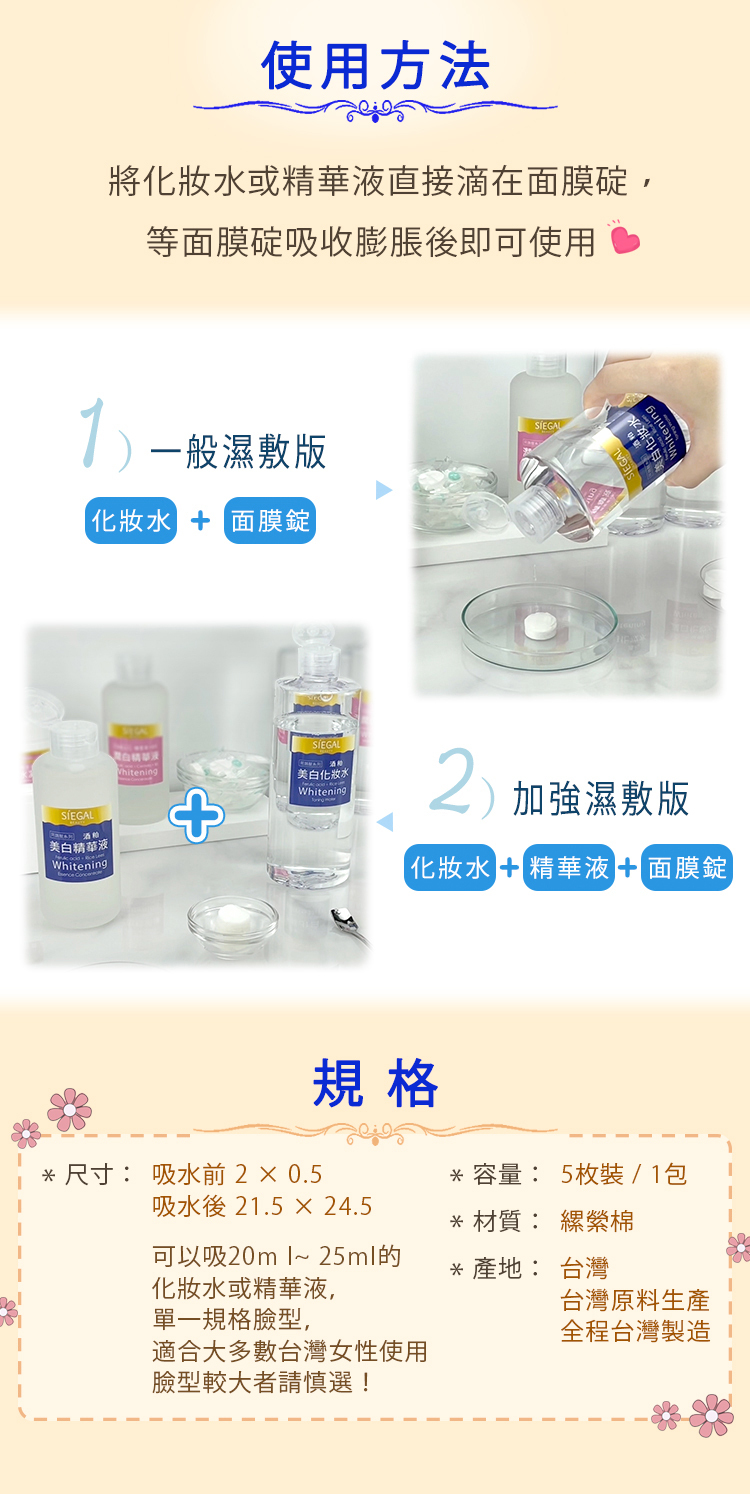 🔸將化妝水或精華液直接滴在面膜碇,等面膜碇吸收膨脹後即可使用。