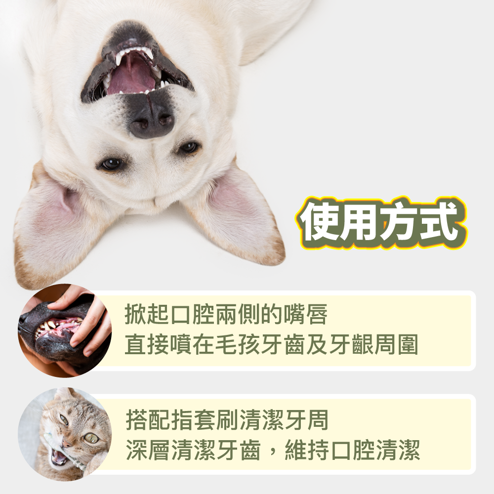 1.掀起口腔兩側的嘴唇,直接噴在毛孩牙齒及牙齦周圍。