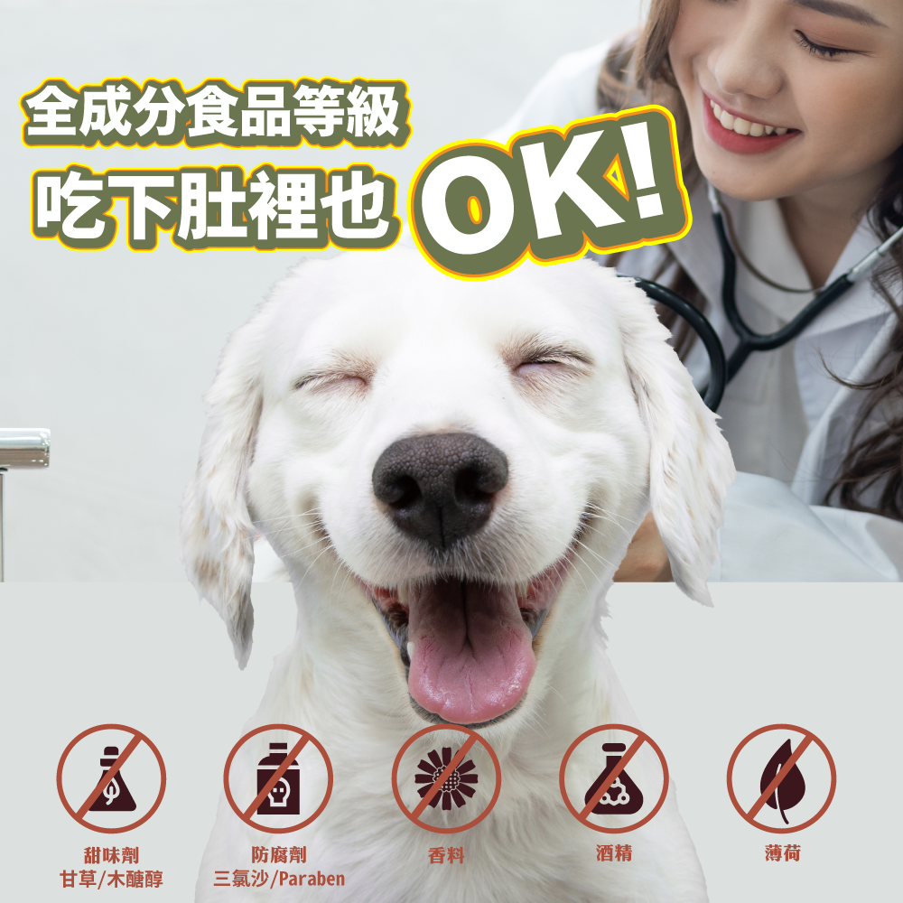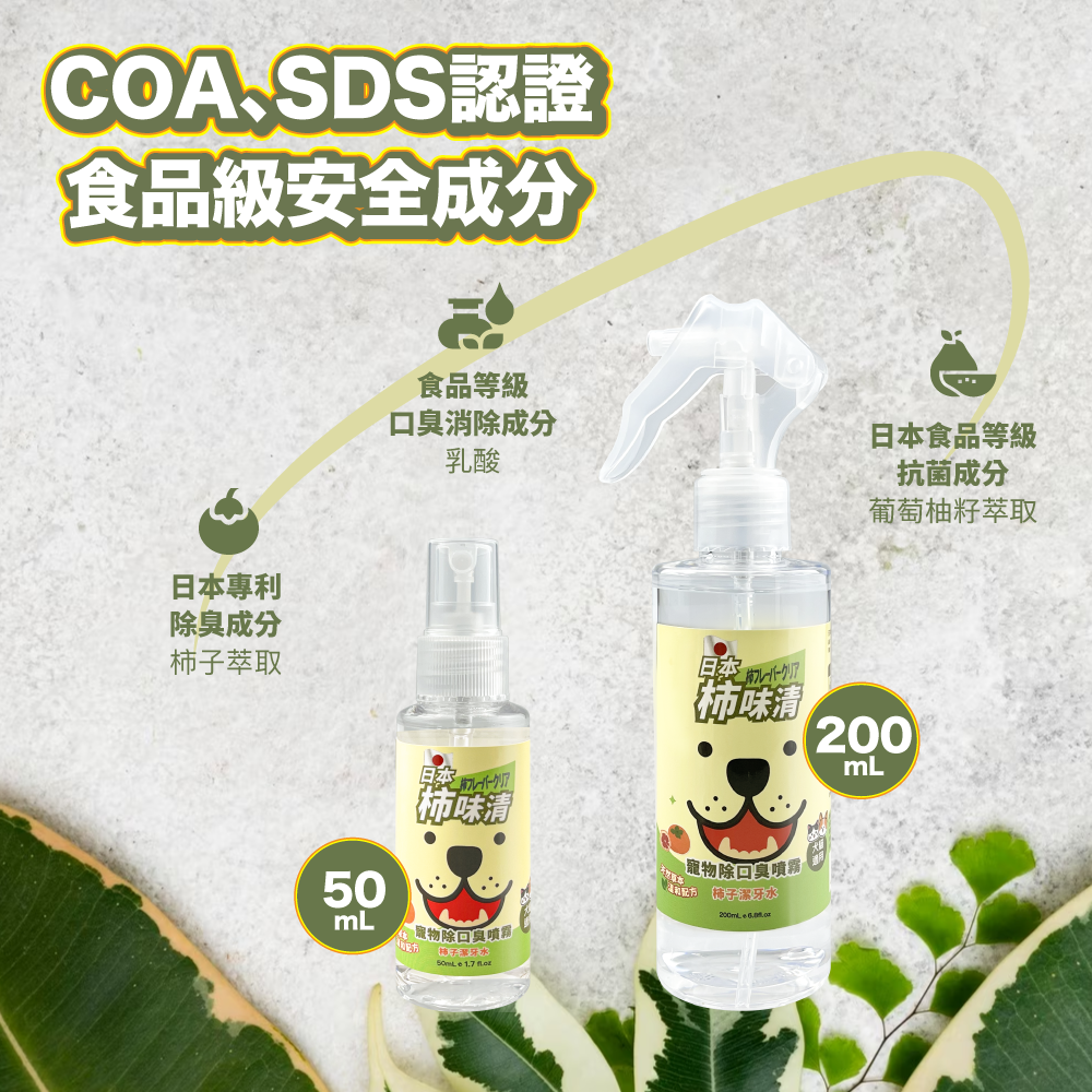 由台灣思高專業團隊研發「柿子潔牙水寵物除口臭噴霧」,採用日本天然草本雙效配方,柿子單寧+柚籽萃取,有效分解口臭及抗菌,維護牙周健康,全食品級配方,不會為了增加適口性,而添加甘草、木醣醇…等甜味劑,造成毛孩腎臟負擔,危害毛孩健康;採用天然的柿子單寧分解毛孩口腔異味,而不是其它廠牌潔牙水常會採用的酒精、香料、薄荷等,用香味去掩蓋口臭;無添加三氯沙、Paraben及苯氧乙醇等化學防腐劑,採用日本厚生省認可的食品級柚籽植萃,不僅具有天然防腐的作用,還能有效抑制毛孩口腔細菌,維護口腔健康。