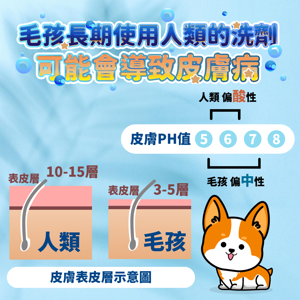毛孩的肌膚與人類不同,如果讓毛孩使用人類用的洗髮精洗毛,是容易讓毛孩產生皮膚病喔,因為毛孩的皮膚pH值範圍約為5.5~7.5偏中性,而人類則是5.2~6.2,屬弱酸性,長期給毛孩使用人類的洗髮精洗澡,會讓毛孩的皮膚變成細菌易孳生的溫床;毛孩的表皮層厚度為3~5層,而人類則為10~15層,相差有約3倍之多,因此毛孩的皮膚較薄,比嬰兒還脆弱,由於人類的洗髮精清潔力較強,容易造成毛孩皮膚乾癢,讓毛孩不停地抓抓抓抓。