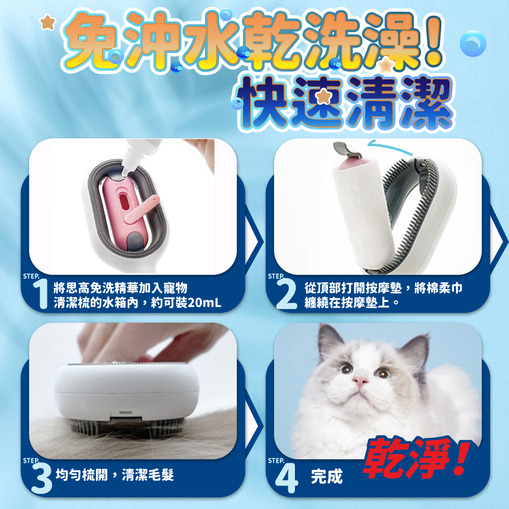 1.將免洗精華注入清潔除毛梳的水箱中即可使用。