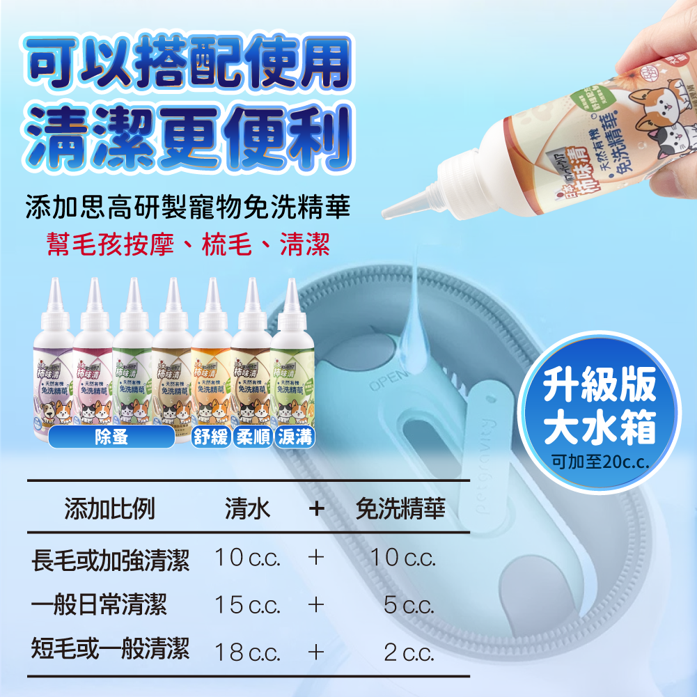 2.添加比例:清水10cc+ 免洗精華10cc(長毛或加強清潔)