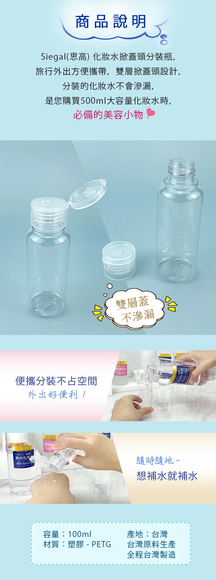 🔸雙層掀蓋頭設計,分裝的化妝水不會滲漏