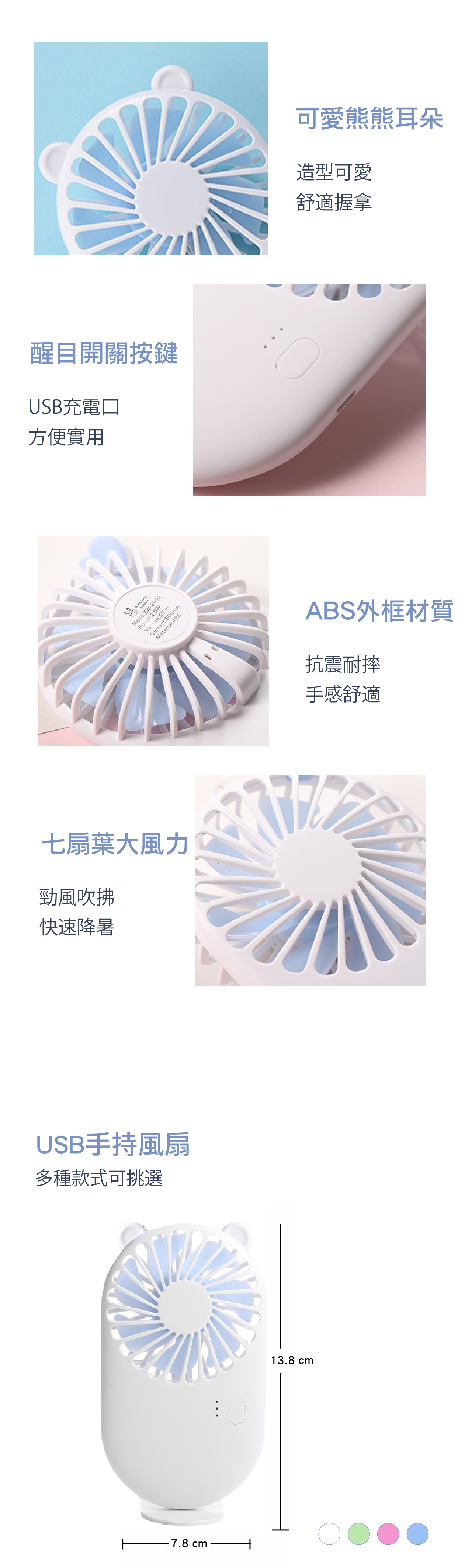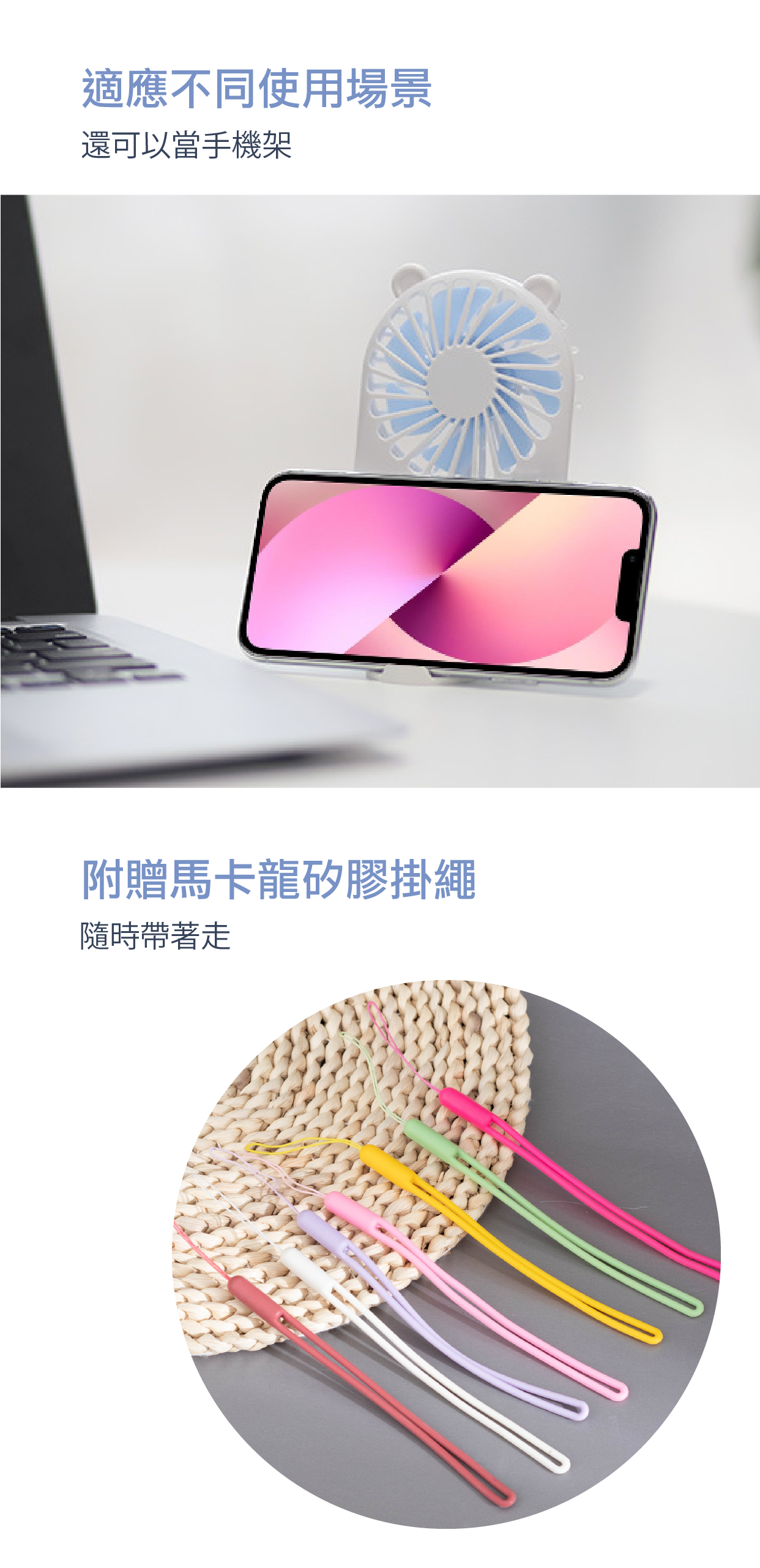 產品內容物:風扇本體*1+桌上立架*1+USB充電線*1+掛繩*1(顏色隨機出貨)〔紙盒裝〕