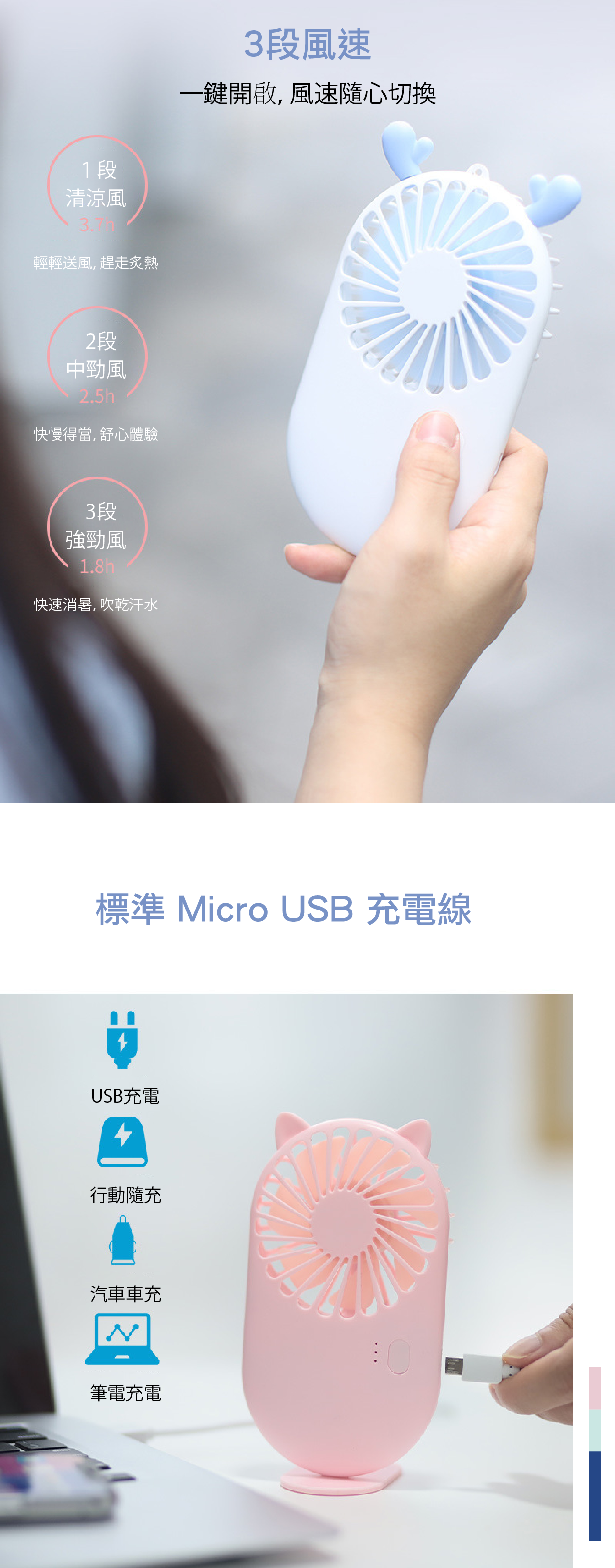 使用附贈USB線充電後,一鍵打開風扇,同一個按鍵可調節風力大小。