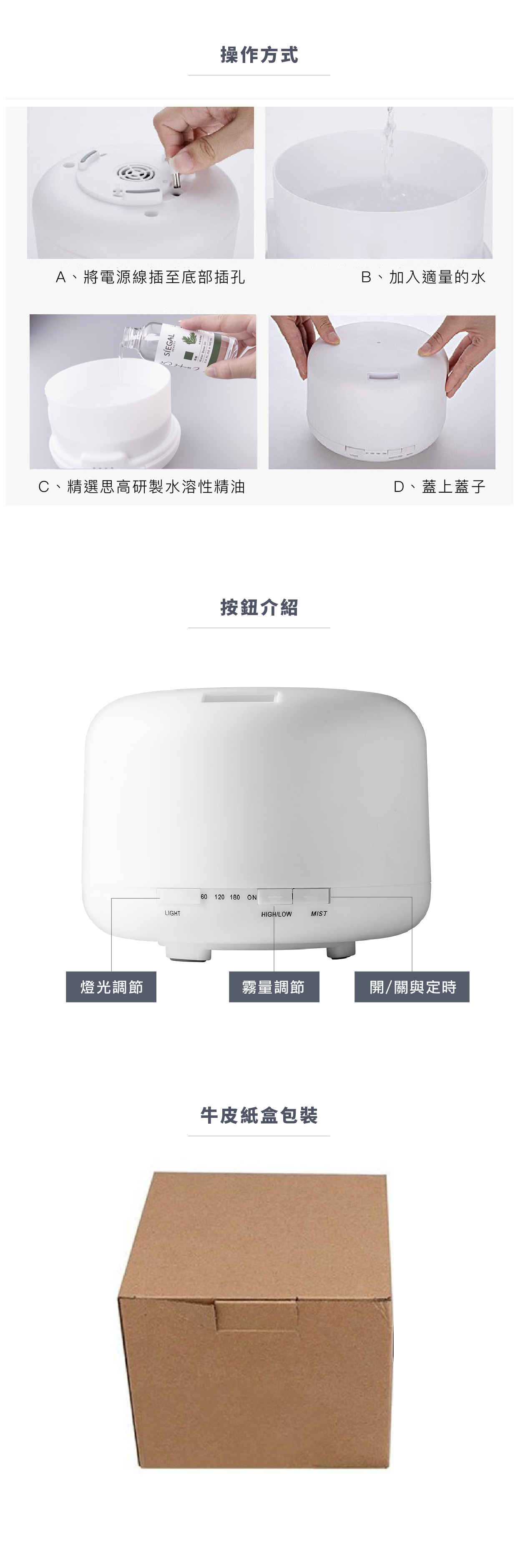 加入適當水量,然後挑選一支🎀思高研製的水溶性精油香味,可依據個人喜好添加精油量,蓋上蓋子後,先按下鍵即可開機使用,再調整使用效果,按鍵詳情可參考說明書使用。